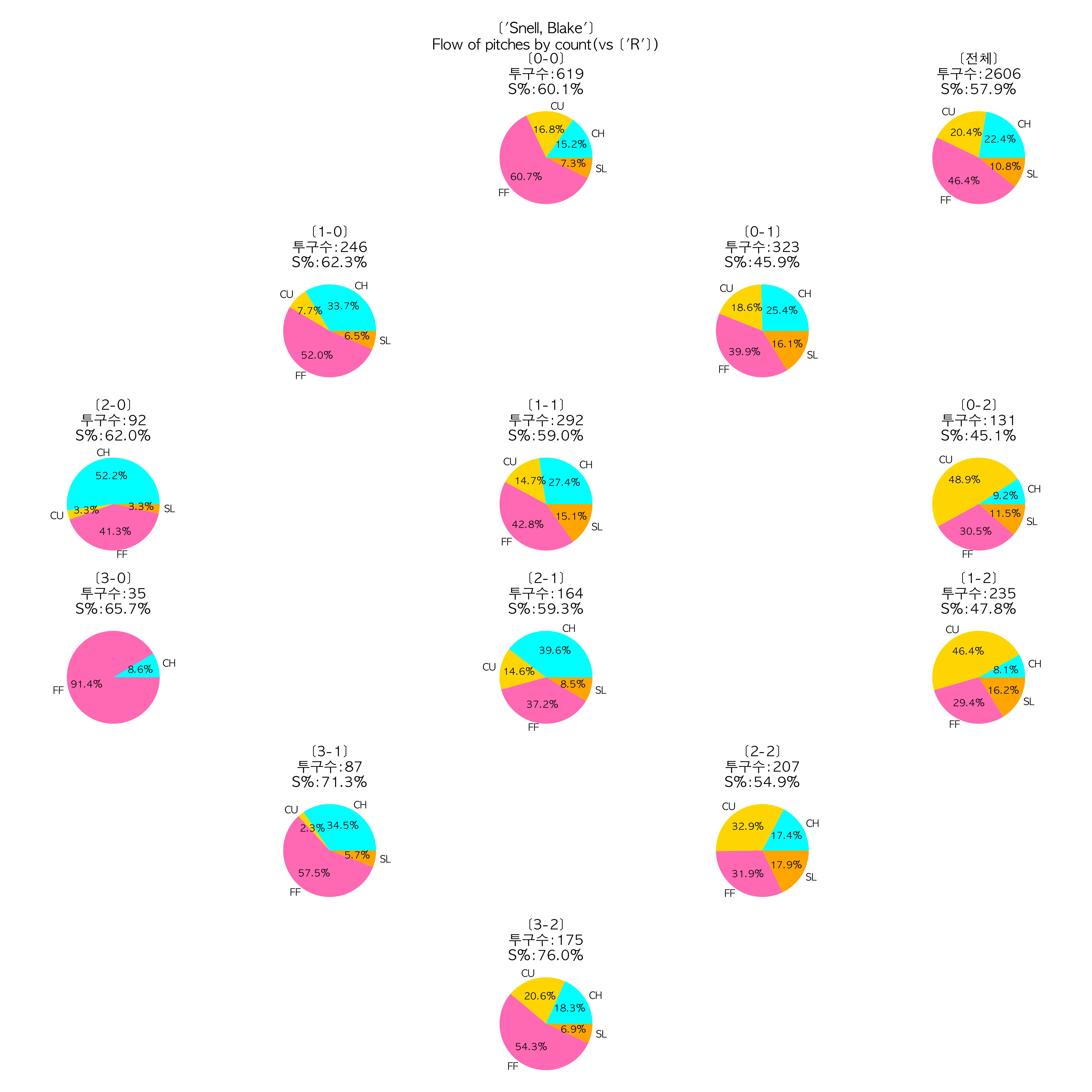 예시의 블레이크 스넬의 경우 위의 표에서 볼 수 있듯이, 좌타자를 상대로 체인지업 구종을 구사하지 않는 대신 패스트볼의 구사 비율을 높인 모습을 볼 수 있다.