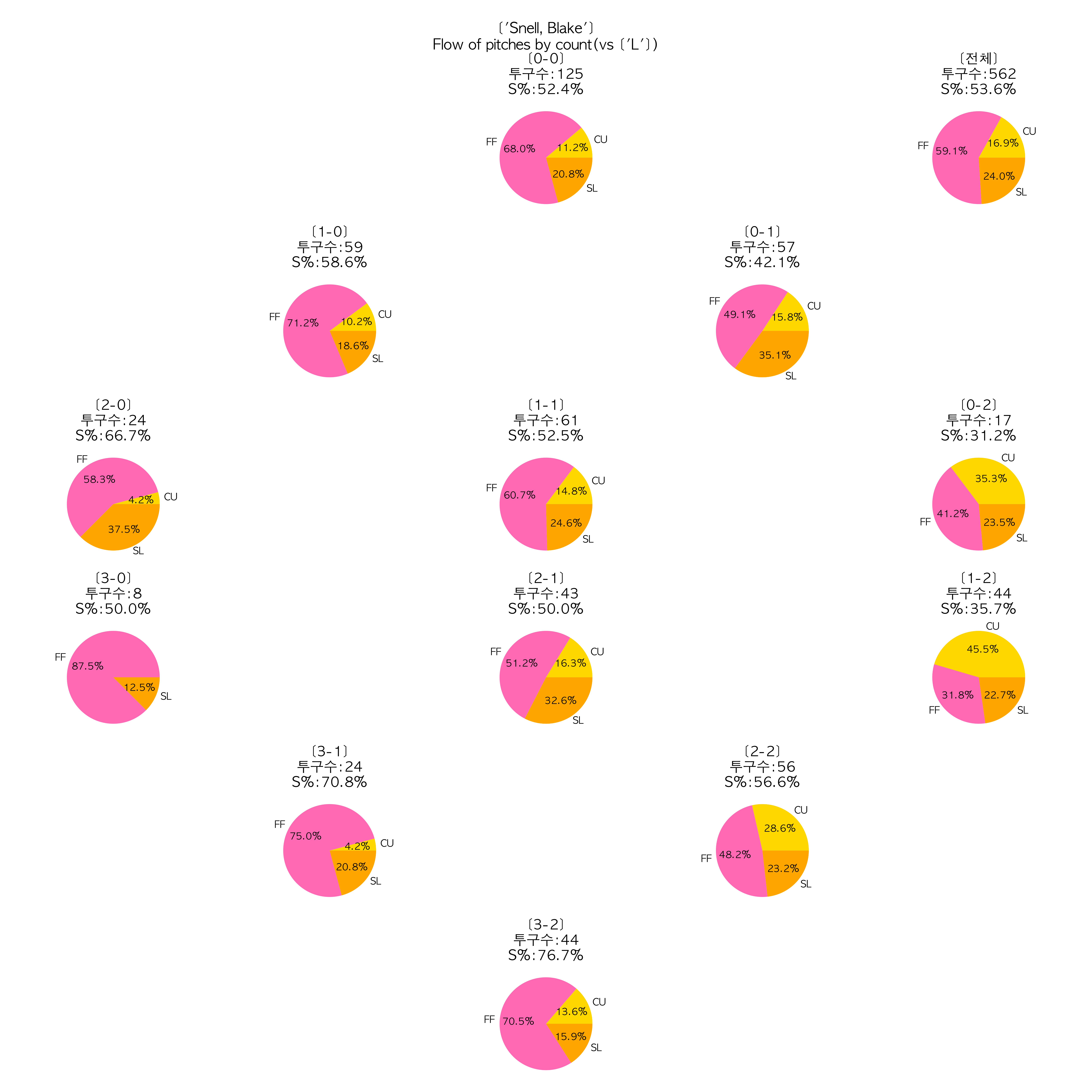 위의 시각화 자료는 상대 타자를 좌, 우 타자로 구분하고, 각각 볼 카운트 상황에 따라 구종 비율, 투구수, 스트라이크 비율을 표현했다.